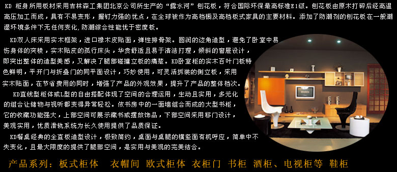 由美國(guó)KD Home Product Inc. 在中國(guó)投資設(shè)立的獨(dú)資企業(yè)--凱蒂(北京)家具有限公司,作為KD整體家居系統(tǒng)在中國(guó)的生產(chǎn)商和提供者,秉承KD公司以設(shè)計(jì)開(kāi)發(fā)為基礎(chǔ)的一貫理念,整合公司的設(shè)計(jì)、生產(chǎn)、開(kāi)發(fā)、配飾等多種資源,依據(jù)客戶的風(fēng)格定位及個(gè)人喜好,給客戶提供一體化的整體家居解決方案,通過(guò)材料的運(yùn)用、色彩的搭配、產(chǎn)品的訂制、家具的擺放,實(shí)現(xiàn)客戶個(gè)性、和諧、優(yōu)雅的整體家居設(shè)計(jì)理念。